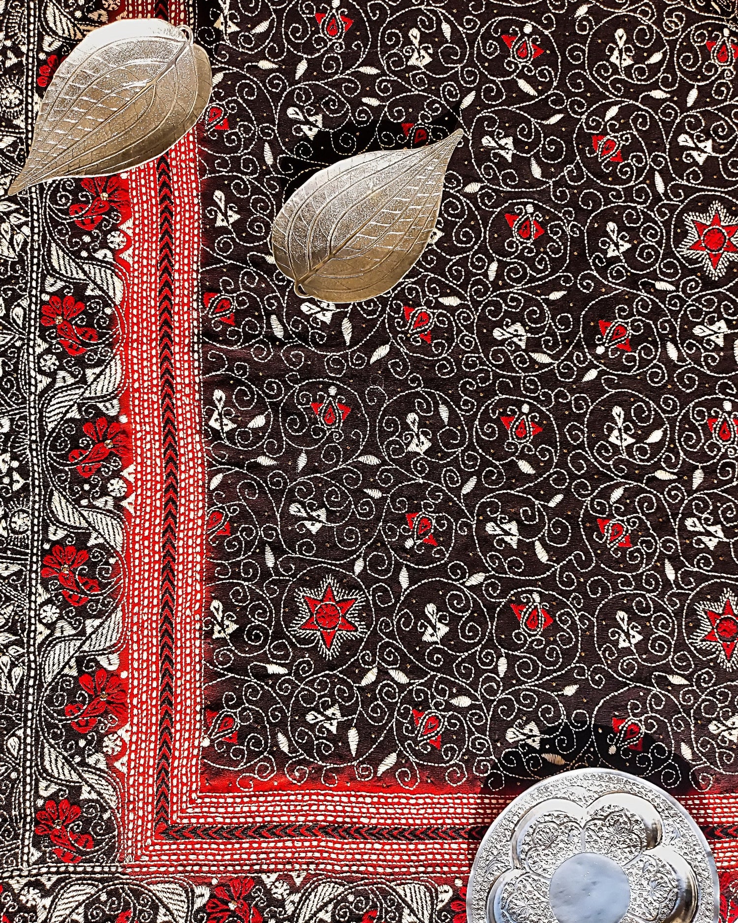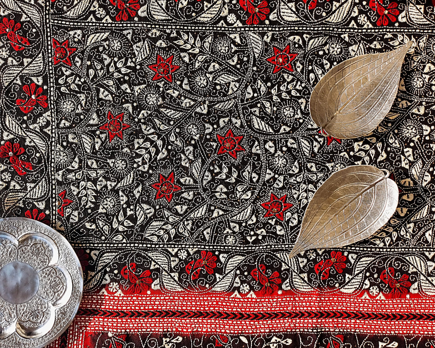 Our striking Black and Chilli Red hand embroidered floral Kantha dupatta on pure Crepe Silk!